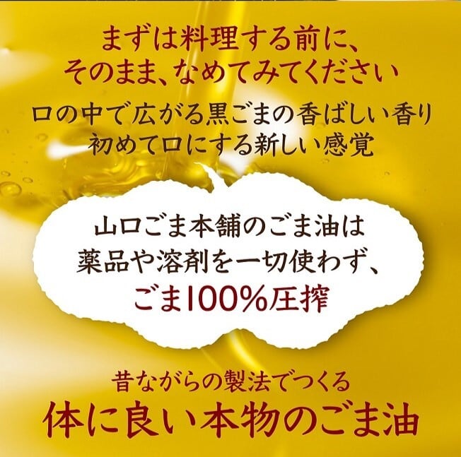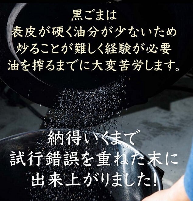 熟練の職人が、厳選した黒ごまの一番香ばしさが引き立つまでじっくりと焙煎して仕上げていく、当社独自の「低温圧搾製法」にてろ過を繰りし、丹精込めて仕上げた商品です。黒ごまの香ばしさが一気に広がりますので、食欲を一層掻き立てられる当店自慢の一品です。