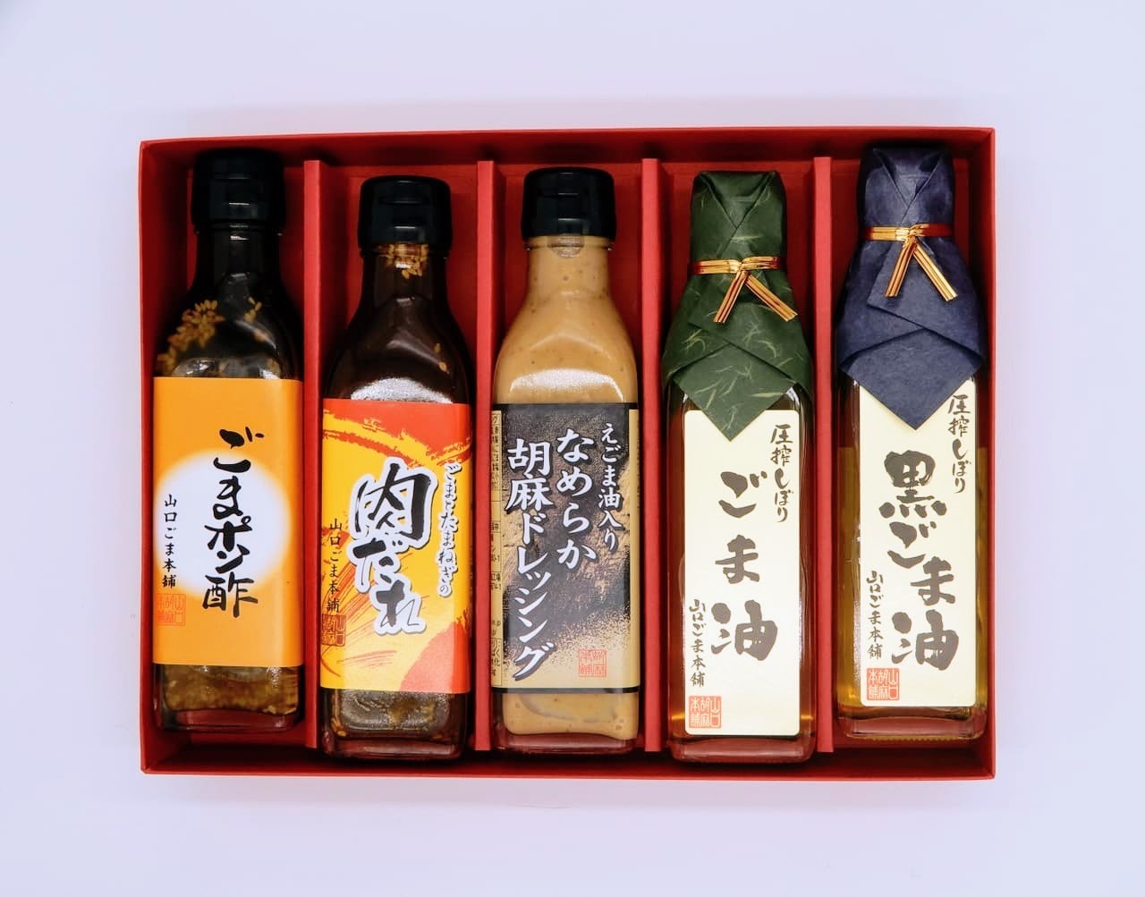 当社独自の「低温圧搾製法」で搾油し、和紙だけで丁寧にろ過を繰り返して精製した、昔ながらのごま油とごまにこだわった、化学調味料、保存料無添加の調味料の詰め合わせセット。
