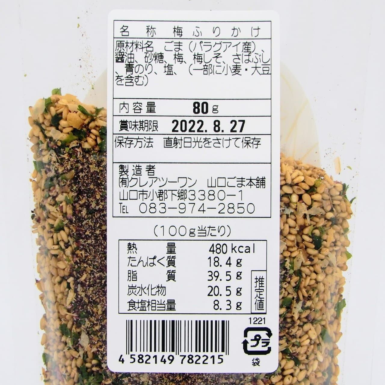 ごま(パラグアイ)、えび、醤油、かつおぶし、青のり、塩(原材料の一部に小麦、大豆を含む)