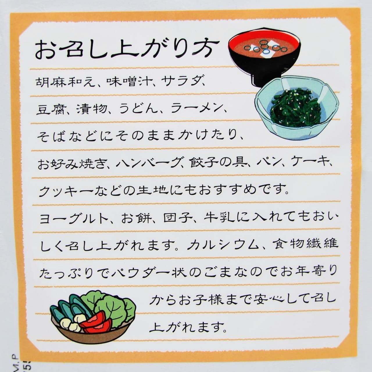 胡麻和えや、豆腐、味噌汁、サラダ、煮物、餃子の具、飲物やヨーグルト、パンやケーキ、クッキーなどの生地の中に練り込んだりと幅広くお使い頂けます。